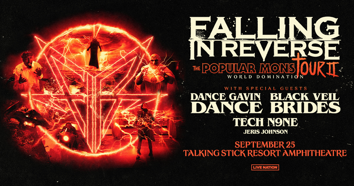 HomeEventsFalling In Reverse - The Popular MonsTOUR II: World Domination This Event has Passed Falling In Reverse - The Popular MonsTOUR II: World Domination Wednesday, September 25, 2024 5:45 PM - 8:45 PM 5:45 PM - 8:45 PM See all dates and Times Talking Stick Resort Amphitheatre - Phoenix Parking Deals Get a Ride LYFT UBER Add to Calendar 09/25/2024 05:45 PM 09/25/2024 08:45 PM America/Boise Falling In Reverse - The Popular MonsTOUR II: World Domination General Parking will be included in the final purchase price.Event LinksTickets: https://go.evvnt.com/2519266-0 Details & Tickets: https://www.upcomingevents.com/phoenix/events/talking-stick-resort-amphitheatre-phoenix/falling-in-reverse-the-popular-monstour-ii-world-domination-262735?ref=uceaddevent Talking Stick Resort Amphitheatre - Phoenix, 2121 North 83rd Avenue, Phoenix, AZ, 85035 Set Reminder Categories Indoor / Outdoor Event, Live Entertainment, Live Performance, Performing Arts Neighborhoods Maryvale (Phoenix) General Parking will be included in the final purchase price.Event LinksTickets: https://go.evvnt.com/2519266-0