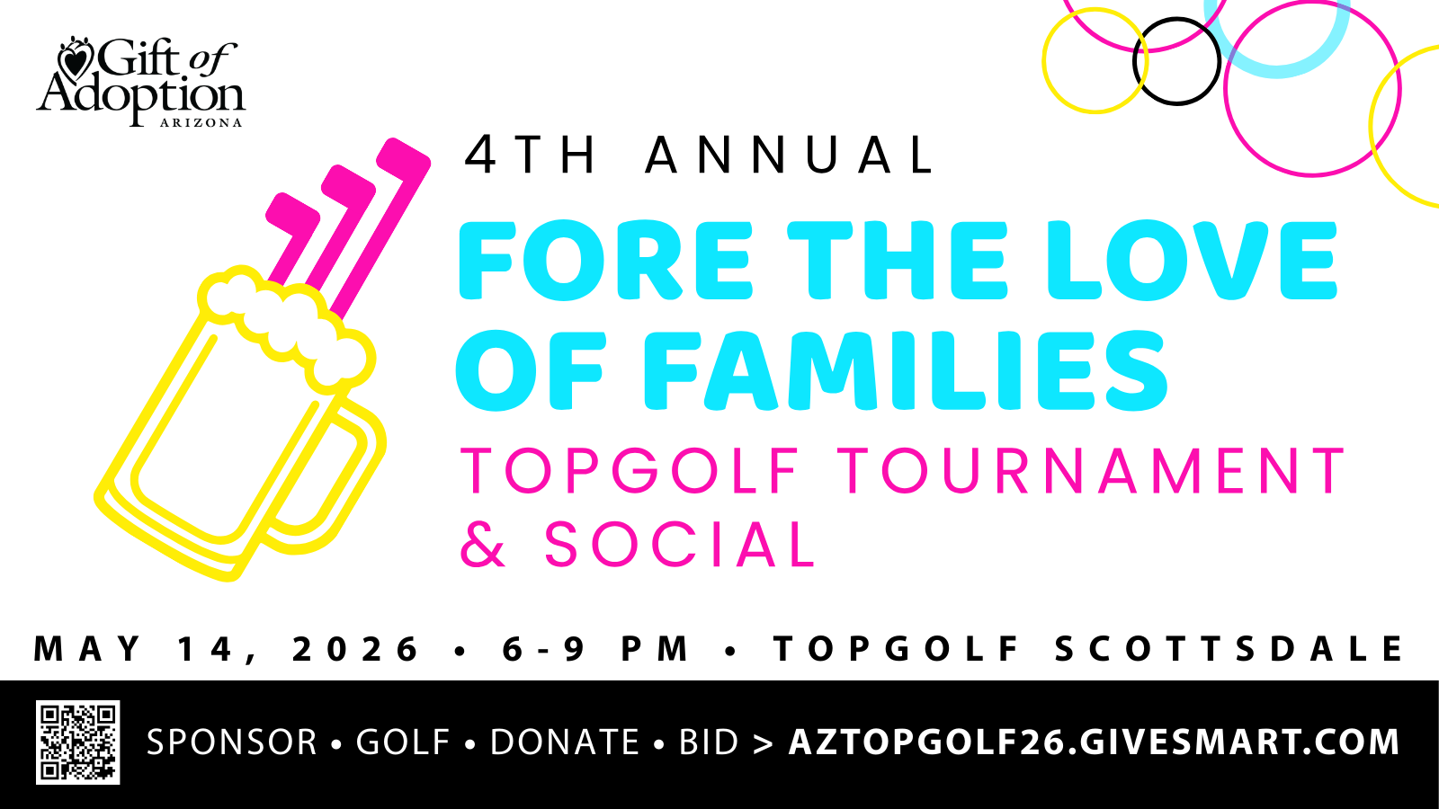 Gift of Adoption invites individuals and corporations to participate in this important work; every dollar we have to give to a family in need is a dollar we first receive from people like you! The Arizona Chapter of Gift of Adoption invites you to join us at our 4th Annual Fore the Love of Families TopGolf Tournament & Social to raise funds for families in Arizona seeking to complete their adoptions.