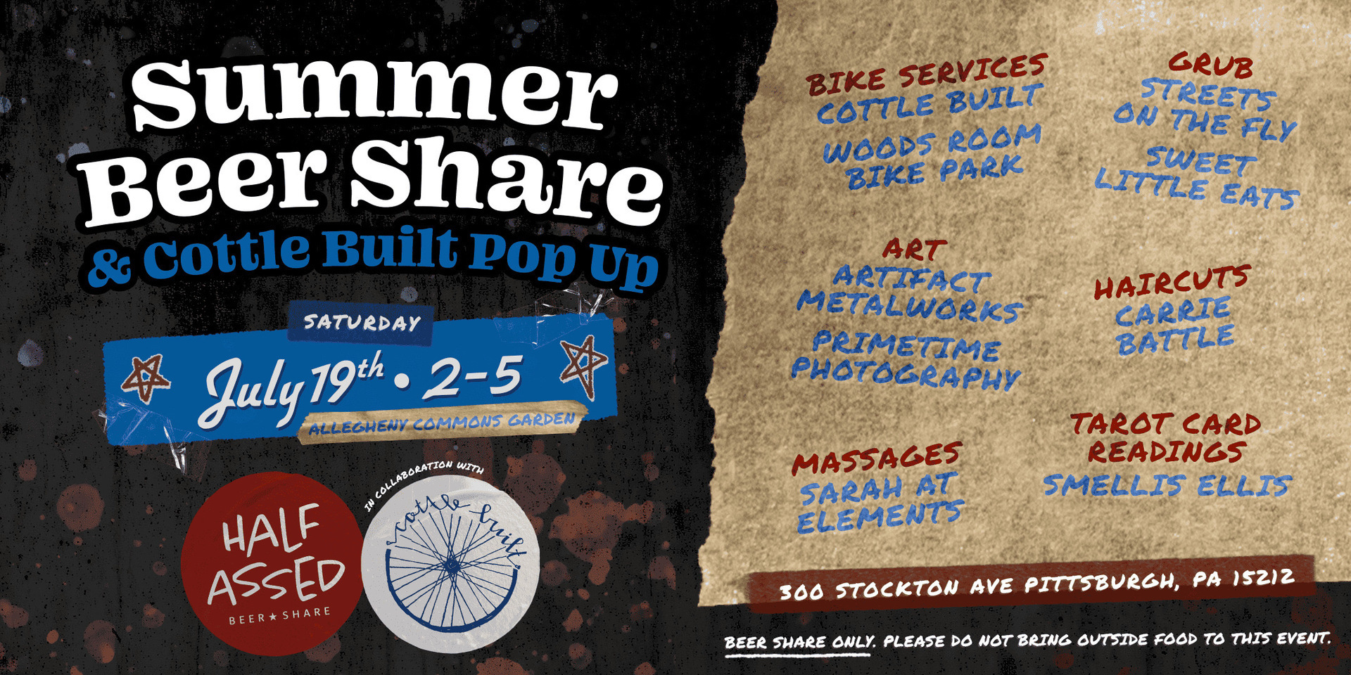 What: Please join us for the Half Assed Beer Share - Summer Share 2024 at the Community Gardens at Allegheny Commons. This is in conjunction with Cottle Built pop-up and Streets on the Fly will be serving up food for purchase.