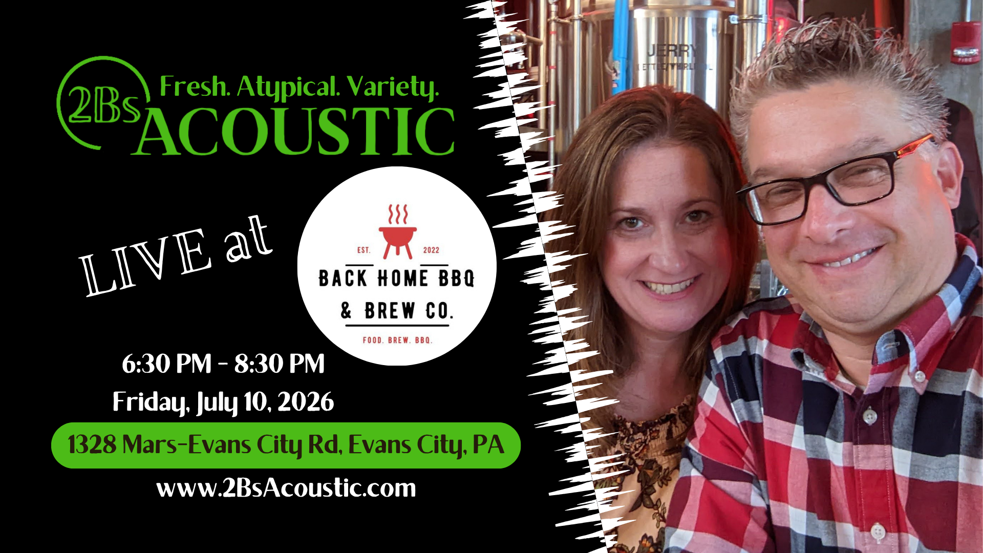 2Bs Acoustic is the husband/wife duo of Bryan and Brenda Hill bringing you a Fresh. Atypical. Variety. of country, classic rock and pop covers from the '80s through today.