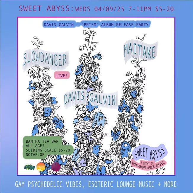 SWEET ABYSS is proud to present a celebratory Spring suaree to honor the release of resident davis galvin exemplary FULL LENGTH ALBUM entitled “PRISM” - released earlier in 2025. Joining the lineup will also be a LIVE PERFORMANCE by locally internationally renowned purveyors of kinetic manifestation slowdanger bringing the beats & moves to make your soul sway, as well as the enigmatic MAITAKE, a longtime friend & selextor known to throw down angular and myopic grooves once in a blue moon