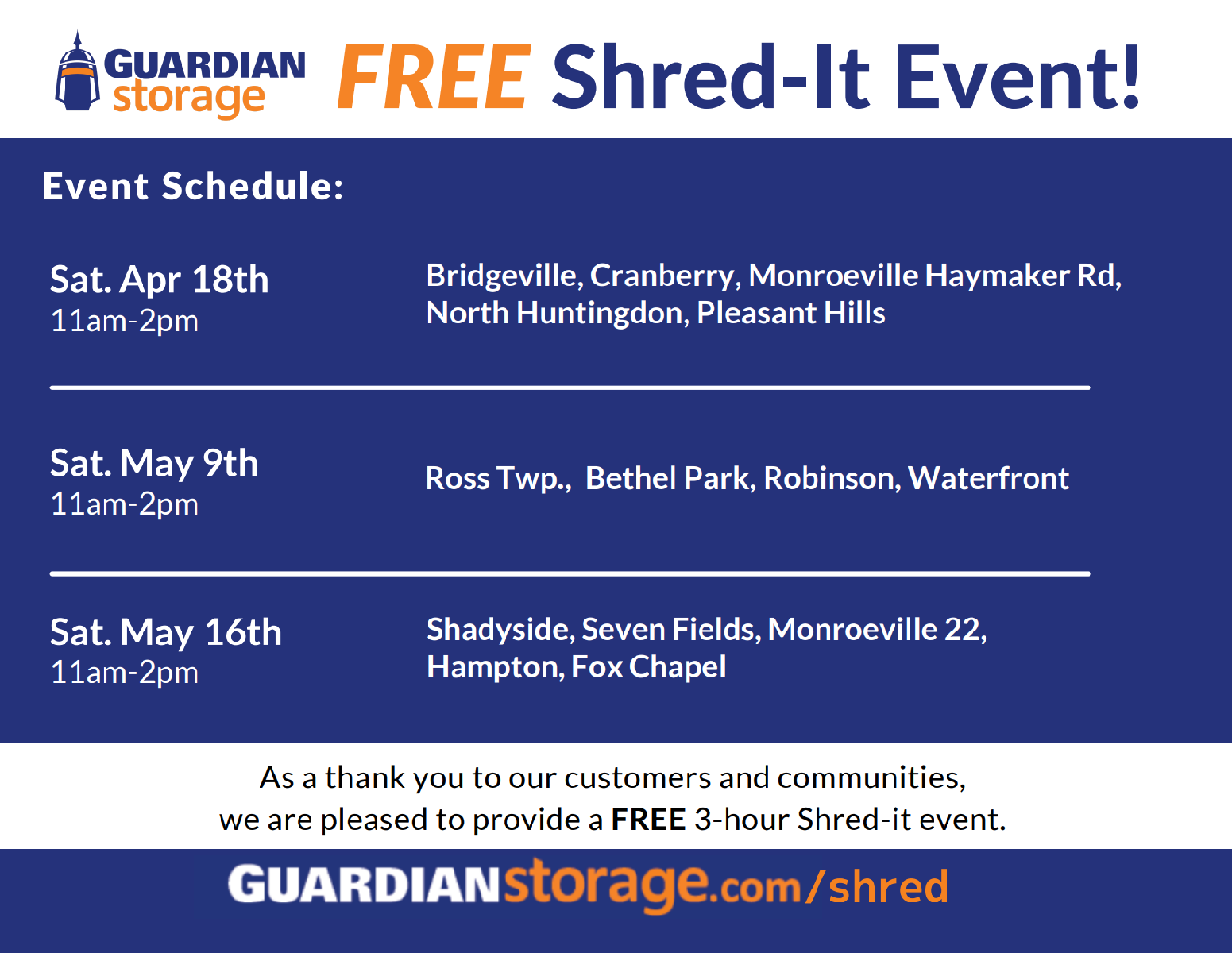 The events on April 18 will take place at the following Guardian Storage locations from 11:00 a.m. - 2:00 p.m.: