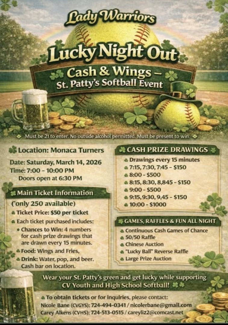 Come to a fun, St.Patty’s themed, night out with numerous chances to win cash and prizes through games/raffles/drawings all night!