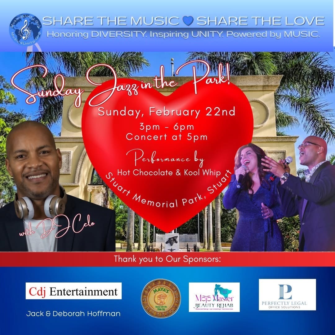 Join Music4Unity for our February Sunday Jazz in the Park, an afternoon of love, community connection, and soul-warming vibes under the Florida sky. Bring your lawn chairs, your blankets, your favorite people β and let the rhythm do the rest.