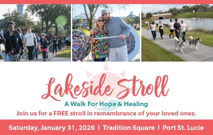 Join us on Saturday, January 31, 2026, 8 am, at Tradition Square in Port St. Lucie for the Lakeside Stroll - A Walk for Hope and Healing. This FREE stroll around the Lake at Tradition is in remembrance of loved ones.