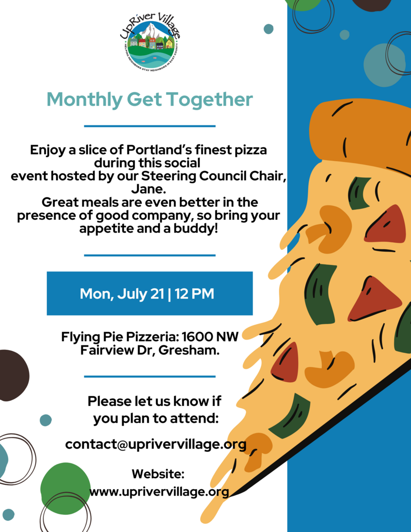 Come join Steering Council Chair, Jane, for UpRIver Village's monthly Pizza Lunch Get-Together. Flying Pie Pizzeria has some of the best pizza in the Portland Metro area. Order your own custom slice(s) and be as creative as you want. This is strictly a social activity. There's no agenda but we will answer questions about UpRIver Village's progress toward opening. PLEASE BRING A FRIEND!