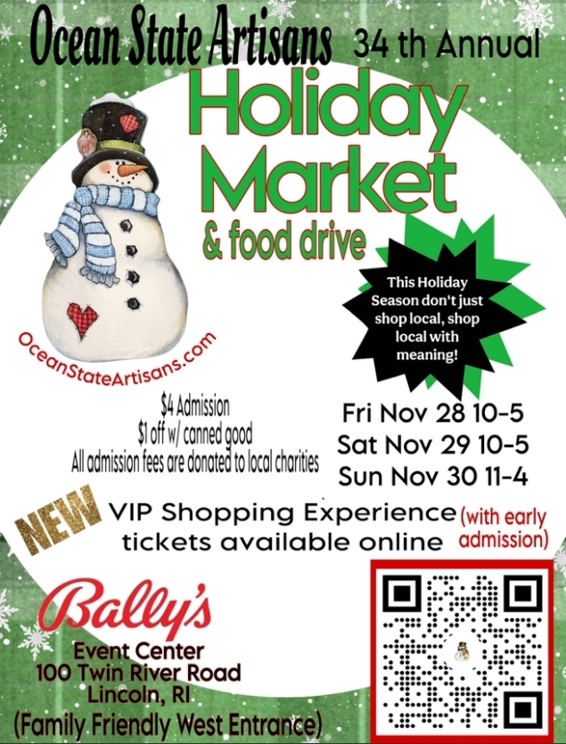 • The 2025 Ocean State Artisans Holiday Market & Food Drive will be held Thanksgiving weekend at Bally’s Event Center, 100 Twin River Road in Lincoln, RI. Follow the snowman signs to the Event Center/West Entrance. The Event Center is non-smoking and has a separate, family-friendly entrance.