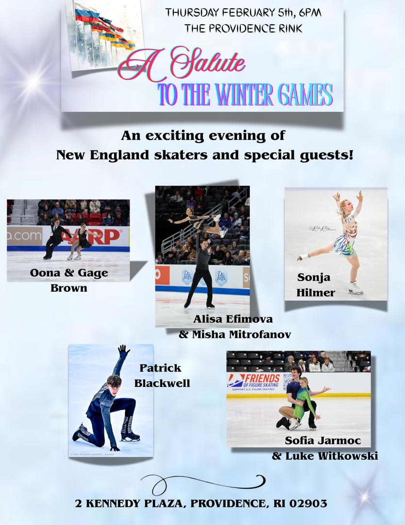 Presented by Pawtucket & Providence Figure Skating Club and hosted by the City of Providence, “A Salute to the Winter Games” will be held at the The Providence Rink to offer the community a glimpse of elite and local figure skating. An evening to showcase rising New England skaters will also feature figure skating champions from across the nation, including 2025 & 2026 U.S. Pairs champions Alisa Efimova & Misha Mitrofanov, 2022 Junior World champions, Oona and Gage Brown, four-time U.S. Championships and international competitor, Sonja Hilmer, and Rhode Island’s own 2026 U.S. Junior Men’s champion, Patrick Blackwell. More performers to be announced soon. Set against the idyllic backdrop of Providence Rink, the evening will inspire spectators while celebrating the spirit of the XXV Winter Olympic Games, set to begin in Milano-Cortina, Italy, February 6-22, 2026. Admission is free, and all are welcome. Attendees should dress warmly.