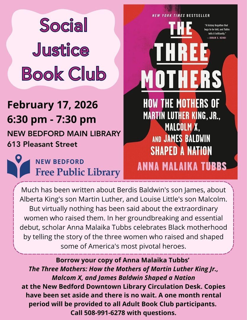 Borrow your copy of Anna Malaika Tubbs’ The Three Mothers: How the Mothers of Martin Luther King Jr., Malcom X, and James Baldwin Shaped a Nation at the New Bedford Downtown Library Circulation Desk. Copies have been set aside and there is no wait. A one month rental period will be provided to all Adult Book Club participants.