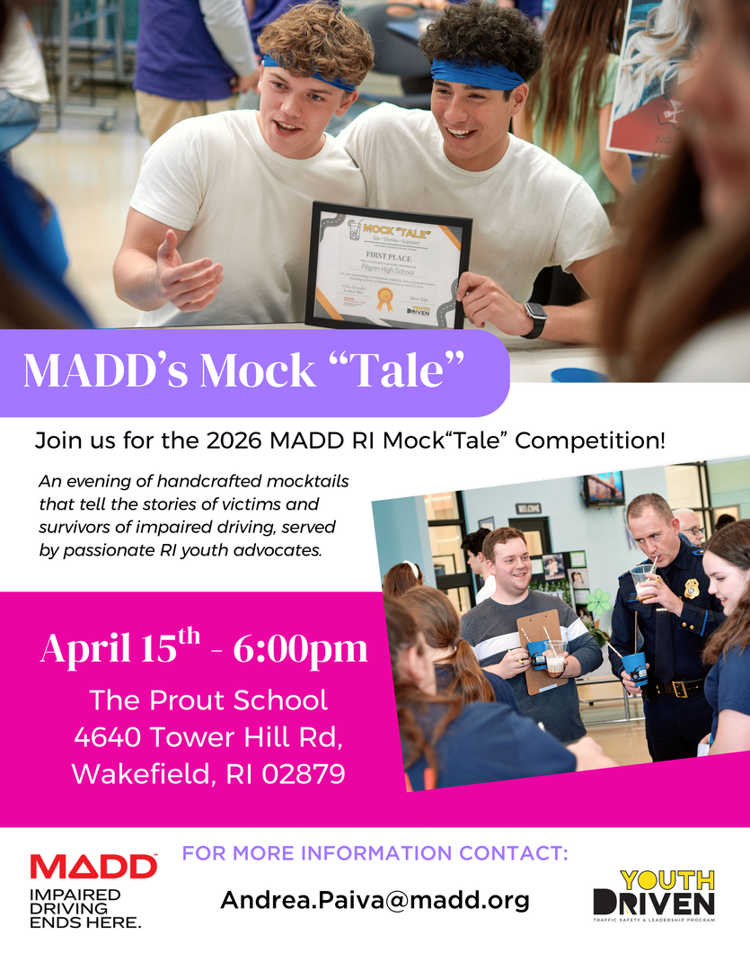 HomeEventsMADD RI Mock"tale" Competition MADD RI Mock"tale" Competition Wednesday, April 15, 2026 6:00 PM - 8:00 PM 6:00 PM - 8:00 PM See all dates and Times Prout School Parking Deals Get a Ride LYFT UBER Add to Calendar 04/15/2026 06:00 PM 04/15/2026 08:00 PM America/Anguilla MADD RI Mock"tale" Competition An evening of handcrafted mocktails that tell the stories of victims and survivors of impaired driving, served by passionate RI youth advocates. This event is free and all are welcome! Details & Tickets: https://www.upcomingevents.com/providence/events/prout-school/madd-ri-mocktale-competition-615480?ref=uceaddevent Prout School, 4640 Tower Hill Road, South Kingstown, RI, 02879 Set Reminder Categories Charities, Good For Families, Kid-Friendly, Kids & Family, Neighborhood An evening of handcrafted mocktails that tell the stories of victims and survivors of impaired driving, served by passionate RI youth advocates. This event is free and all are welcome!
