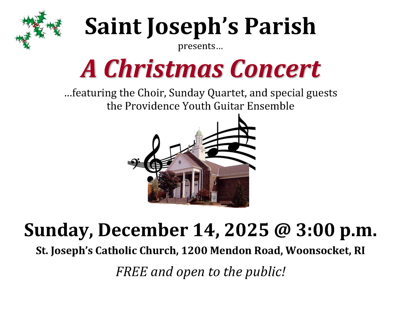 St. Joseph's Church in Woonsocket presents: "A Christmas Concert" on Sunday, December 14th @ 3PM