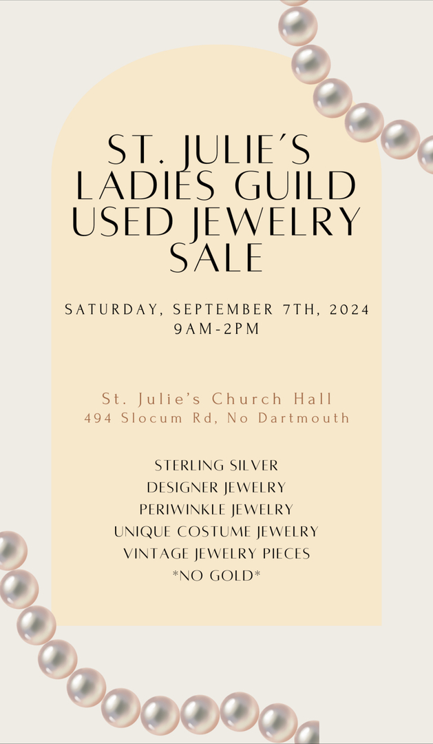 HomeEventsSt. Julie’s Ladies Guild Used Jewelry Sale This Event has Passed St. Julie’s Ladies Guild Used Jewelry Sale Saturday, September 07, 2024 9:00 AM - 2:08 PM 9:00 AM - 2:08 PM See all dates and Times St Julie Billiart Church Hall Parking Deals Get a Ride LYFT UBER Add to Calendar 09/07/2024 09:00 AM 09/07/2024 02:08 PM America/Atikokan St. Julie’s Ladies Guild Used Jewelry Sale Sterling silver , Designer Jewelry, Periwinkle Jewelry, Unique Costume Jewelry, Vintage pieces **No Gold Details & Tickets: https://www.upcomingevents.com/providence/events/st-julie-billiart-church-hall/st-julies-ladies-guild-used-jewelry-sale-273610?ref=uceaddevent St Julie Billiart Church Hall, 494 Slocum Road, Dartmouth, MA, 02747 Set Reminder Categories Neighborhood, Outdoor Event Neighborhoods Bliss Corner (Dartmouth)Smith Mills (Dartmouth) Sterling silver , Designer Jewelry, Periwinkle Jewelry, Unique Costume Jewelry, Vintage pieces **No Gold