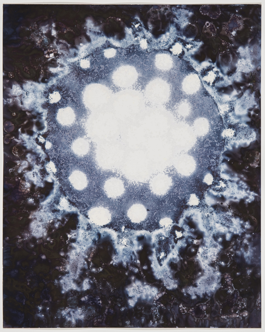 The work in this exhibition explores circles and spheres as atoms or planets—representing the microcosm and macrocosm of the physical world—as well as symbols of growth and wholeness. Featured photographs include recent, previously unshown experiments with rust and bubbles from 2024 and 2025, alongside large-scale cameraless scrolls from 2005–2011, many of which exceed 100 inches in height. Additionally, the artist created a special video for this exhibition offering a behind-the-scenes view of her innovative processes.