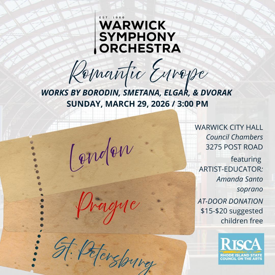WSO continues its 59th Season with a program of Romantic works by Borodin, Smetana, Elgar, and Dvorak. This event will be presented by the 60+ member symphony, led by Music Director CATHERINE GAGNON, and will feature Artist-Educator Amanda Santo - soprano. This performance offered at Warwick City Hall - Council Chambers is fully accessible to all audiences and parking is plentiful at City Hall, surrounding lots, and on-street.