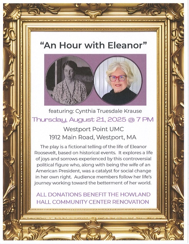 The Westport Point United Methodist Church, 1912 Main Road, Westport Point, is pleased to host "An Hour with Eleanor", on Thursday, August 21st at 7 pm. This is a one woman play by Cynthia Truesdale Krause about the life of Eleanor Roosevelt. Cynthia has worked in theater since 1989, playing many roles over the years. Her love for theater lead her toward playwriting and she created this play, exploring a life of joys and sorrows experienced by Eleanor Roosevelt. Eleanor was not only the wife of an American president, but also a catalyst for social change in her own right. Please join us for this free event. Donations will be accepted at the door and will benefit the Howland Hall Community Center Renovation Project. The Westport Point United Methodist Church and the attached Howland Hall Community Center are part of the National Register of Historic Places, and the community center is in need of repairs and improved accessibility. Thank you for supporting this cause and joining us for an evening of theater.