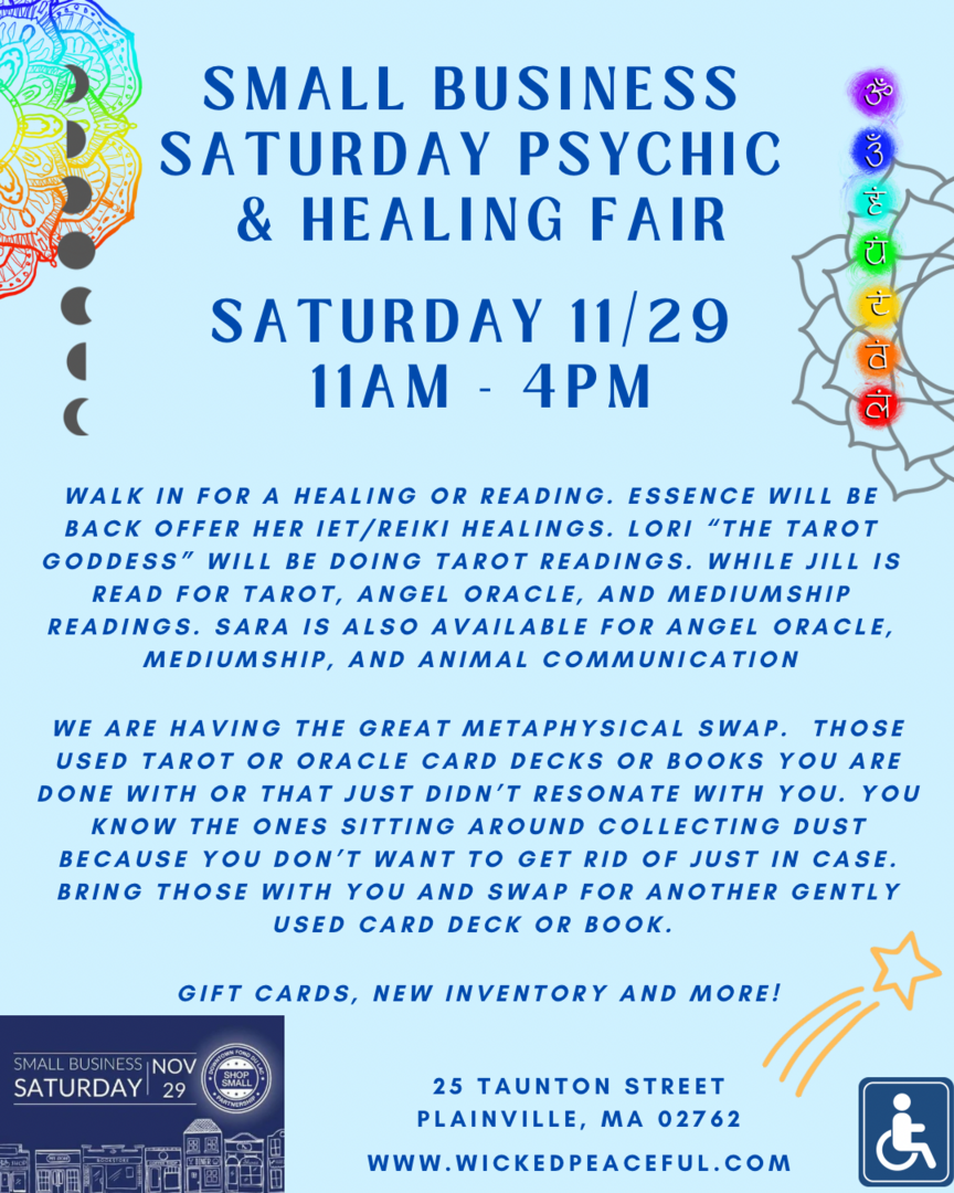 Join us Saturday, November 29th for small business Saturday. 11am - 4pm we will be having psychic intuitive, tarot, Angel Oracle cards, mediumship and animal communication readings. Plus Integrated Energy Therapy, Reiki Energy Healing. All services $40 for 20 minutes.