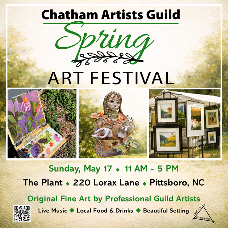 The Chatham Artists Guild invites the community to celebrate art, music, and spring at its very first Spring Outdoor Art Festival on Saturday, May 17, from 11:00 AM to 5:00 PM at The Plant - 220 Lorax Lane, in Pittsboro, NC.