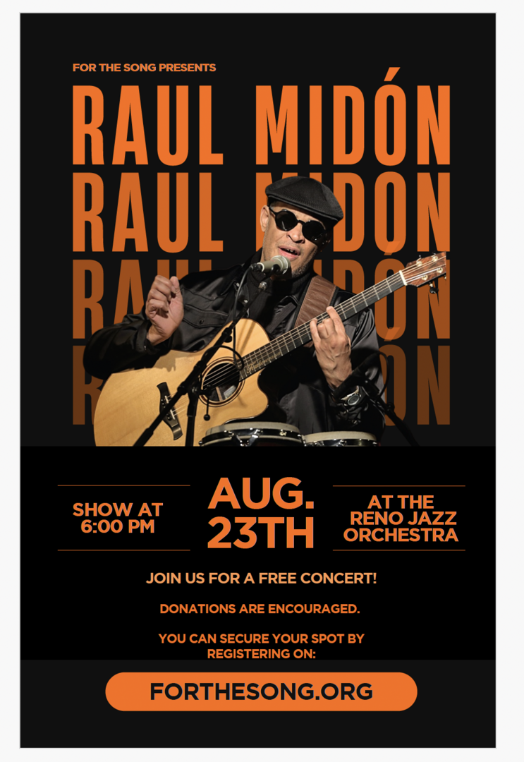 An evening of unforgettable jazz awaits! Join us for a free concert featuring the amazing Raul Midón at the Reno Jazz Orchestra on August 23rd at 6 PM. A master at combining genres, The New York Times says his music “suggests a three-way fusion of Stevie Wonder, Bobby McFerrin and José Feliciano.” Be sure to register on the For the Song website to get your ticket.