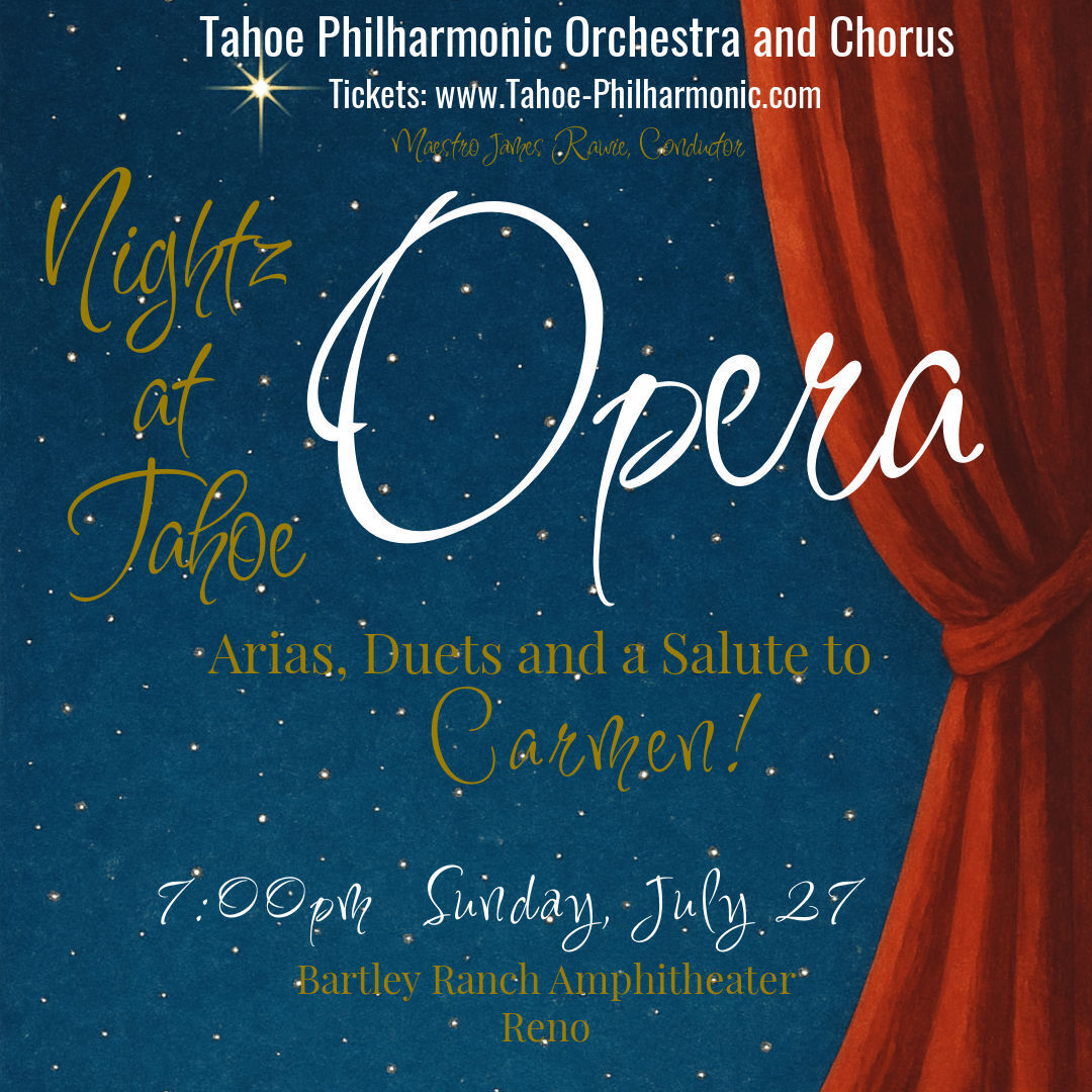 Nightz at Tahoe Opera: Arias, Duets & A Salute to Carmen brings soaring voices, fiery passion, and majestic music to Bartley Ranch! Sunday, July 27.