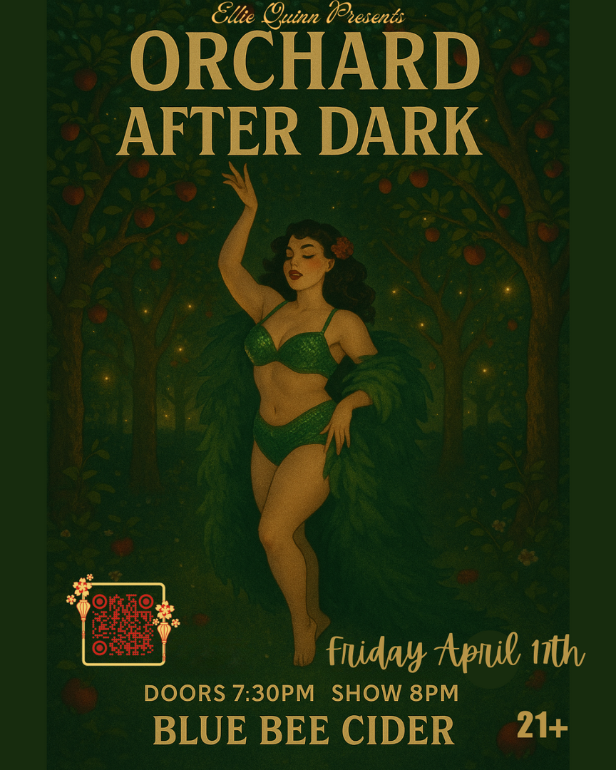 Orchard After Dark is a sultry, whimsical burlesque experience set in an enchanted orchard, where magic blooms and desire lingers in the air. Nestled beneath the twinkle of fairy lights and the boughs of apple trees at Blue Bee Cider, this immersive summer showcase invites you to indulge in fantasy, temptation, and transformation.
