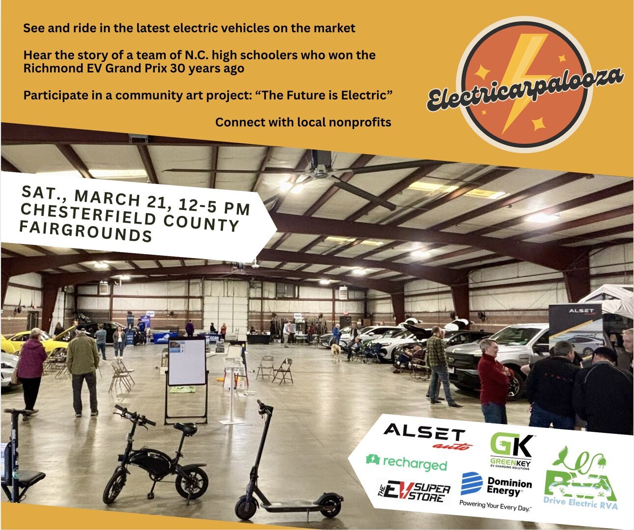 Join us for our sixth annual extravaganza of all things EV. We are assembling Richmond's largest display of electrified rides, both new and used. Pets and families are welcome to this indoor event at the Exhibition Hall on the Chesterfield County Fairgrounds.