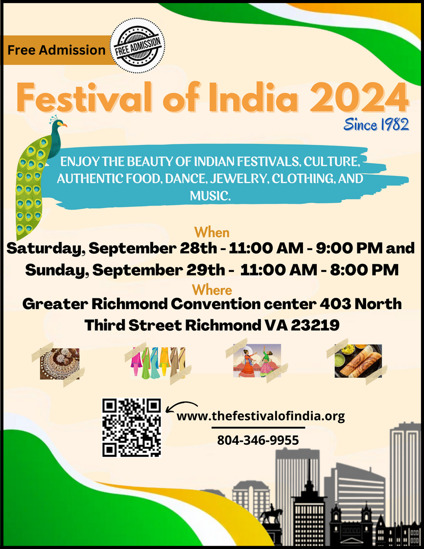 At the Festival of India, one can enjoy a renowned cultural program, consisting of classical and modern Indian live performances, as well as East-West fusion dance and music. One can also sample many different varieties of Indian cuisine, including vegetarian and non-vegetarian delicacies, such as dosa, kachori, samosas, tandoori chicken and sweets, all of which are supplied by local Indian restaurants and families, and prepared fresh in front of patrons. Vendors also sell a smorgasbord of traditional Indian clothing, jewelry, movies, music and other colorful souvenirs.
