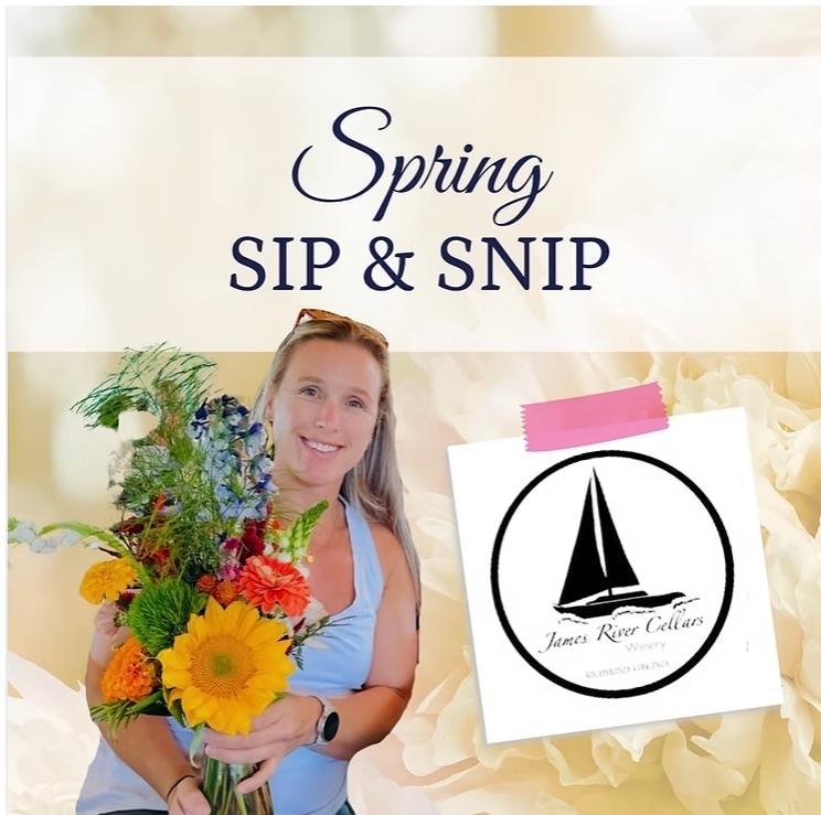 Join us for a delightful afternoon of creativity and connection at the beautiful James River Cellars Winery for our Sip & Snip Flower Bar! Immerse yourself in the beauty of fresh, seasonal blooms as you learn to craft your own stunning floral arrangement. Our Sip & Snip events combine the joy of flower arranging with the pleasure of sipping on a delicious glass of James River Wine.