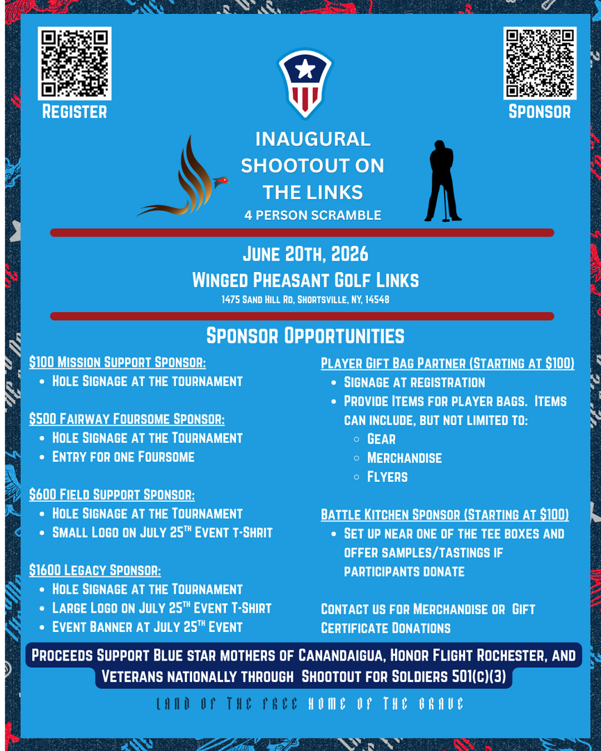 Shootout for Soldiers Canandaigua inaugural golf tournament. Hosted at the beautiful Winged Pheasant Golf Links, this event is more than just a round of golf - it's an opportunity to support the men and women who have served our country.