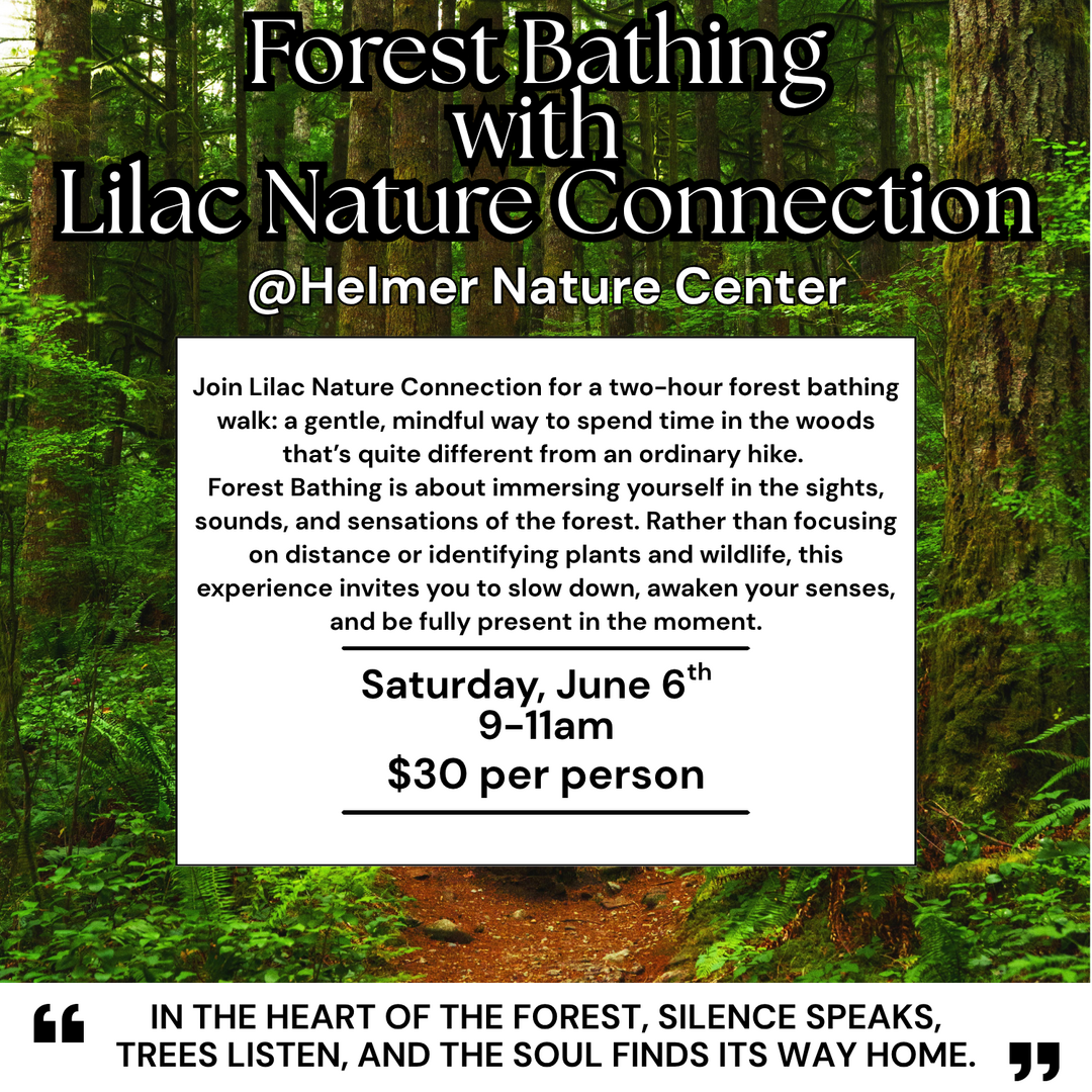 Despite the name, there’s no water involved; the “bathing” is about immersing yourself in the sights, sounds, and sensations of the forest. Rather than focusing on distance or identifying plants and wildlife, this experience invites you to slow down, awaken your senses, and be fully present in the moment. Through a series of flexible, guided invitations, we’ll wander together, noticing what the forest offers and connecting with one another along the way. We’ll close with light snacks and a chance to reflect on the experience.