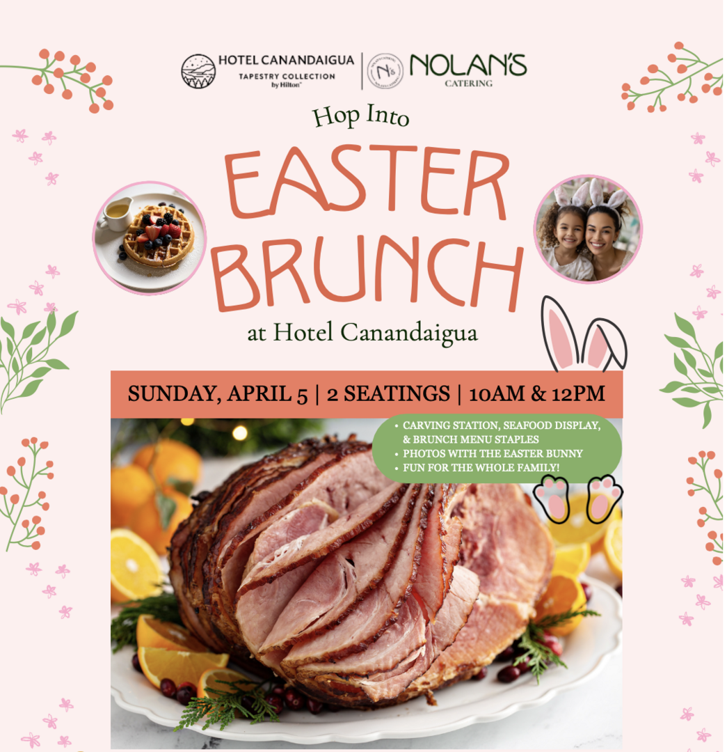 Join us at Hotel Canandaigua, Tapestry by Hilton on Sunday, April 5 for a delightful morning and a magnificent spread of all of the brunch favorites you know and love. This menu has been thoughtfully constructed by Nolan's Catering to highlight seafood lovers, a carving station with Easter ham and turkey, brunchworthy mains and sides, options for the kids, and a dessert display filled with treats you can't miss...especially for the little ones!