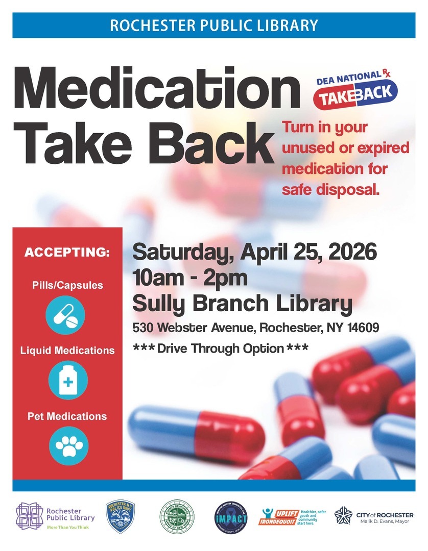 The City of Rochester, in partnership with Uplift Irondequoit and Monroe County Addiction Services Team IMPACT, will host a free medication take-back event as part of the Drug Enforcement Administration’s National Prescription Take Back Day.