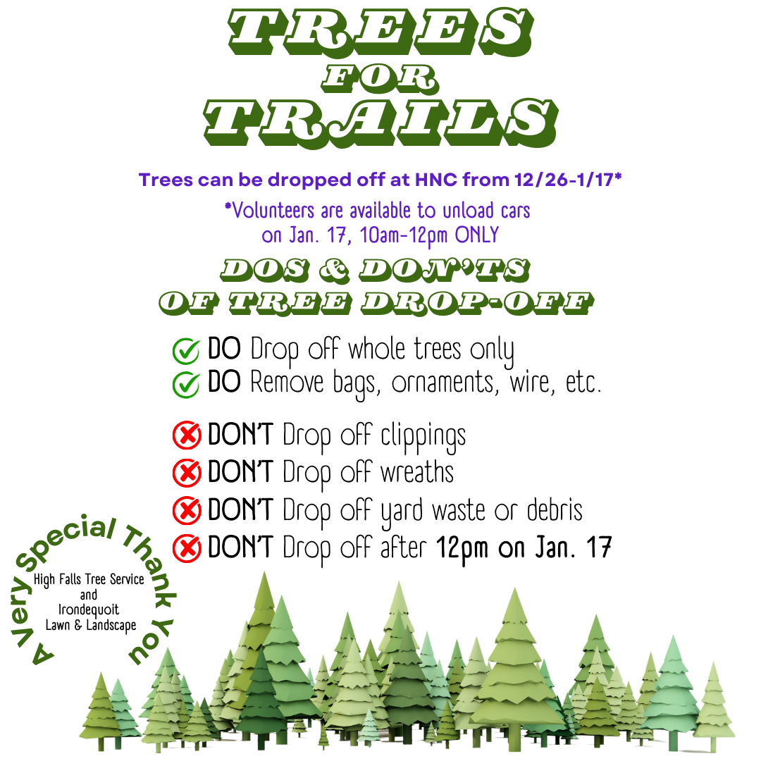 Local residents have been donating their Christmas trees to our Trees for Trails event since 1976. The Nature Center accepts trees from Christmas until mid-January, when High Falls Tree Service and Irondequoit Lawn & Landscape come to transform the trees into wood chips. Volunteers help unload trees and spread the chips, which will control erosion on our trails all year.