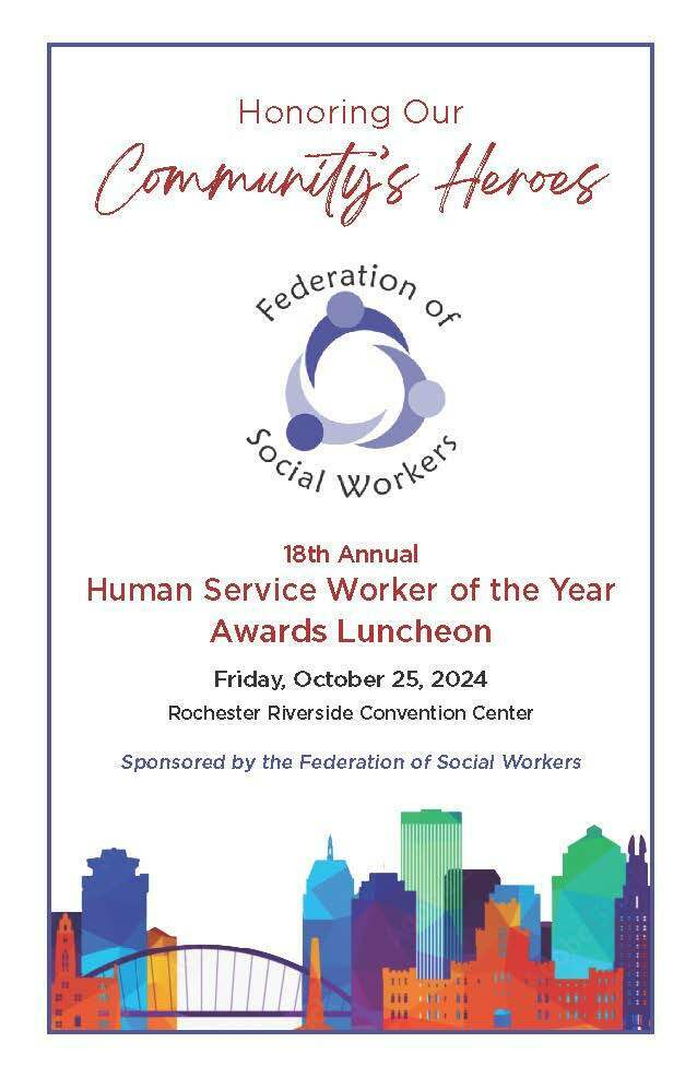 The Federation of Social Workers (FSW) is pleased to announce the honorees for the 2024 Human Service Worker of the Year Awards. The awards will be presented at a luncheon this Friday, October 25th at the Rochester Riverside Convention Center from 11:30 - 1:30 pm, and is open to the public. It is $35.00 per person and Registration is Required.