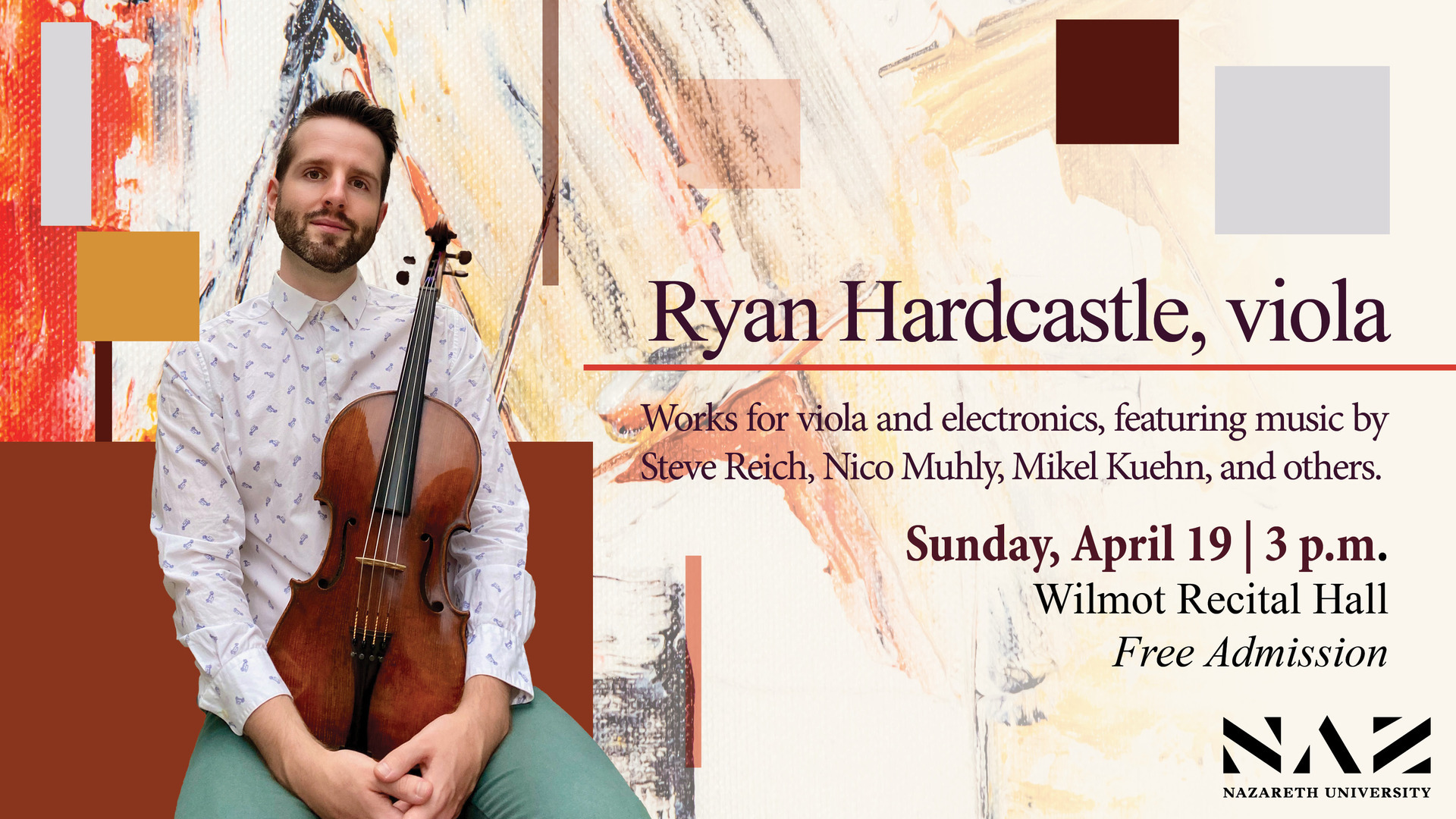 HomeEventsRyan Hardcastle, viola Ryan Hardcastle, viola Sunday, April 19, 2026 3:00 PM - 4:30 PM 3:00 PM - 4:30 PM See all dates and Times Nazareth University Wilmot Recital Hall Parking Deals Get a Ride LYFT UBER Add to Calendar 04/19/2026 03:00 PM 04/19/2026 04:30 PM America/Atikokan Ryan Hardcastle, viola Works for viola and electronics, featuring music by Steve Reich, Nico Muhly, Mikel Kuehn, and others. Event LinksWebsite: https://go.evvnt.com/3389656-0 Details & Tickets: https://www.upcomingevents.com/rochester/events/nazareth-university-wilmot-recital-hall/ryan-hardcastle-viola-573789?ref=uceaddevent Nazareth University Wilmot Recital Hall, 4245 East Avenue, Rochester, NY, 14618 Set Reminder Categories Live Performance, Performing Arts View Event Website » Works for viola and electronics, featuring music by Steve Reich, Nico Muhly, Mikel Kuehn, and others. Event LinksWebsite: https://go.evvnt.com/3389656-0 Read More View Less