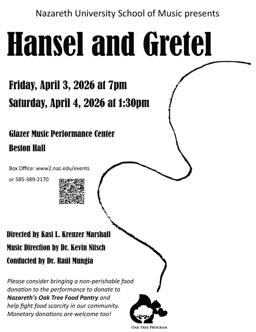 Nazareth University's School of Music invites you into a world of wonder with Humperdinck's timeless fairy-tale opera. Join adventurous siblings Hansel and Gretel as they wander into an enchanted forest in search of strawberries—only to lose their way and meet magical creatures, including a cunning witch with a taste for trouble. Performed with the Nazareth Orchestra, this delightful opera is a sweet treat for the whole family! Performed in English, with projected supertitles.