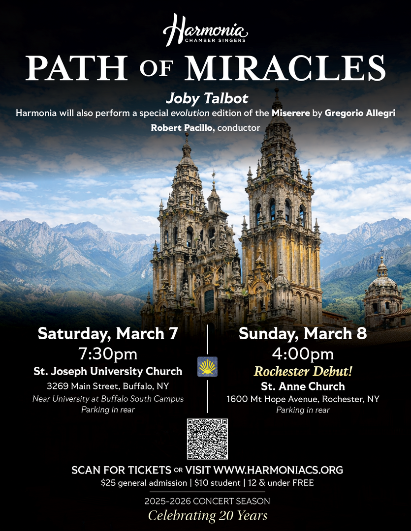 Path is a stunning musical pilgrimage, taking listeners along the famous Camino de Santiago. Written for 17 voices and percussion, Path was premiered by Tenebrae in 2005 at St. Bartholomew-the-Great Church in London. Harmonia will also perform a special "evolution" edition of the Miserere by Gregorio Allegri, going from the unadorned original, to the reharmonized embellished version, to the modern score with the glorious soaring top C. Robert Pacillo, conductor