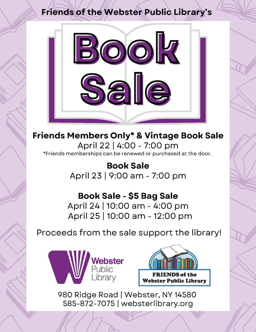 HomeEventsFriends of the Webster Public Library - Spring Book Sale Friends of the Webster Public Library - Spring Book Sale Saturday, April 25, 2026 10:00 AM - 12:00 PM 10:00 AM - 12:00 PM See all dates and Times Webster Public Library Parking Deals Get a Ride LYFT UBER Add to Calendar 04/25/2026 10:00 AM 04/25/2026 12:00 PM America/Anguilla Friends of the Webster Public Library - Spring Book Sale The Friends of the Webster Public Library is having their annual Spring Book Sale. Proceeds from the sale support the library! Details & Tickets: https://www.upcomingevents.com/rochester/events/webster-public-library/friends-of-the-webster-public-library-spring-book-sale-620849?ref=uceaddevent Webster Public Library, 980 Ridge Road, Webster, NY, 14580 Set Reminder Categories Education, Educational, Good For Families The Friends of the Webster Public Library is having their annual Spring Book Sale. Proceeds from the sale support the library!