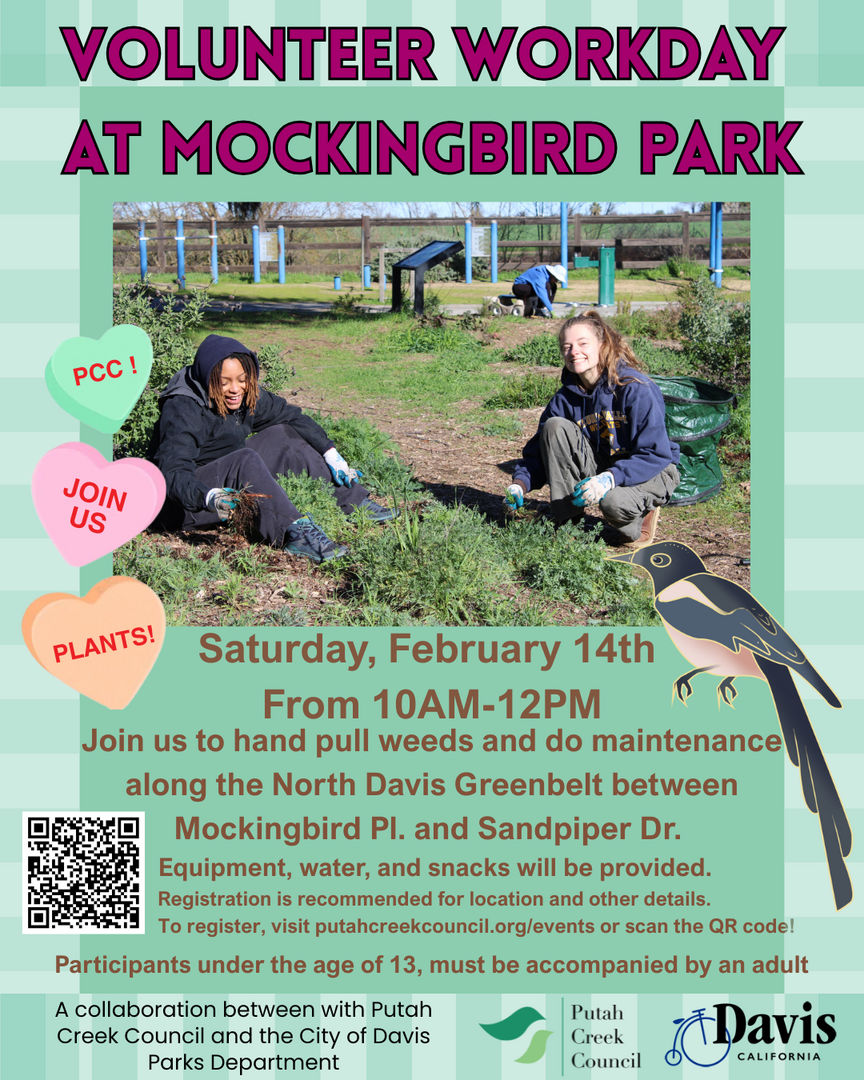 Please wear sturdy, close-toed shoes, weather-appropriate clothing, and bring a reusable water bottle. All necessary equipment, water, and snacks will be provided. Participants under the age of 13 must be accompanied by an adult. The garden is located along the North Davis Greenbelt between Mockingbird Pl. and Sandpiper Dr., parking is available on Mockingbird Pl.