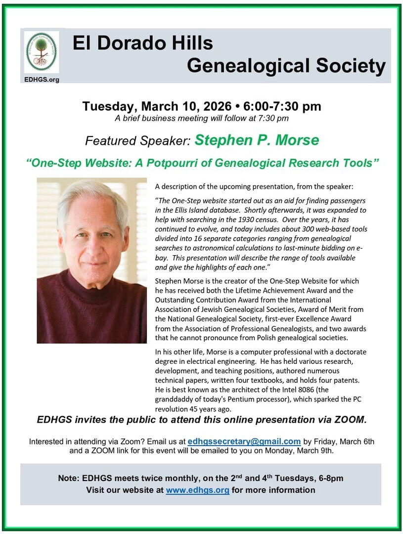 Join EDHGS' Mar. 10, 2026 Zoom presentation from 6-8PM, "One-Step Website: A Potpourri of Genealogical Research Tools" by Stephen P. Morse. Email [email protected] for the Zoom link and details. Head on over to www.edghs.org for more information, including a convenient online form to apply for EDHGS membership!