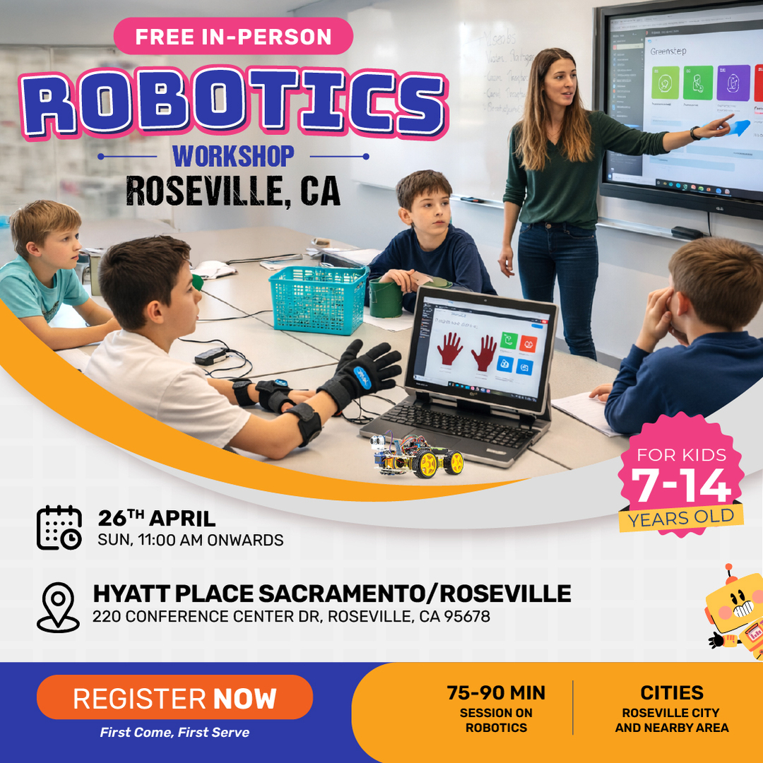 Moonpreneur extends a warm invitation to you and your child for our upcoming free in-person robotics workshop at Roseville, CA on 26th April, Sunday at 11:00 AM PDT.