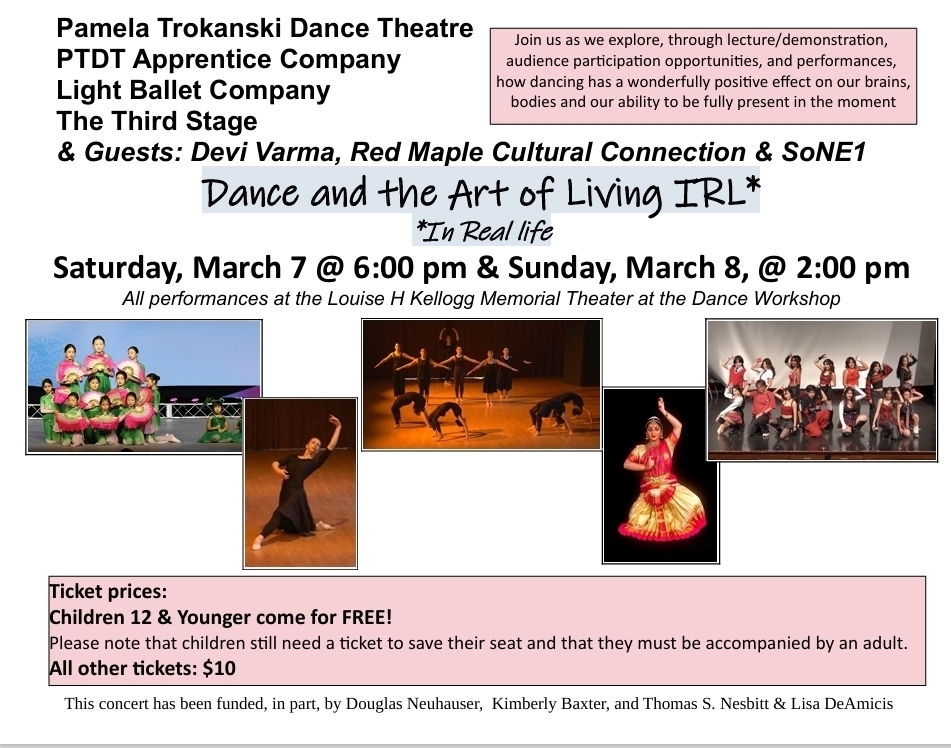 The concert begins with a lecture-demonstration by Pamela and dancers from the Pamela Trokanski Dance Theatre, PTDT Apprentice Company, The Third Stage, and Light Ballet Company.