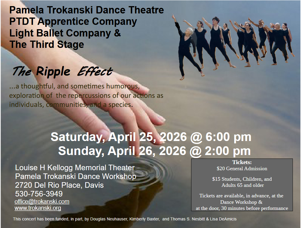 All performances are held at the Louise H. Kellogg Memorial Theater, located at the Pamela Trokanski Dance Workshop, 2720 Del Rio Place, in Davis.