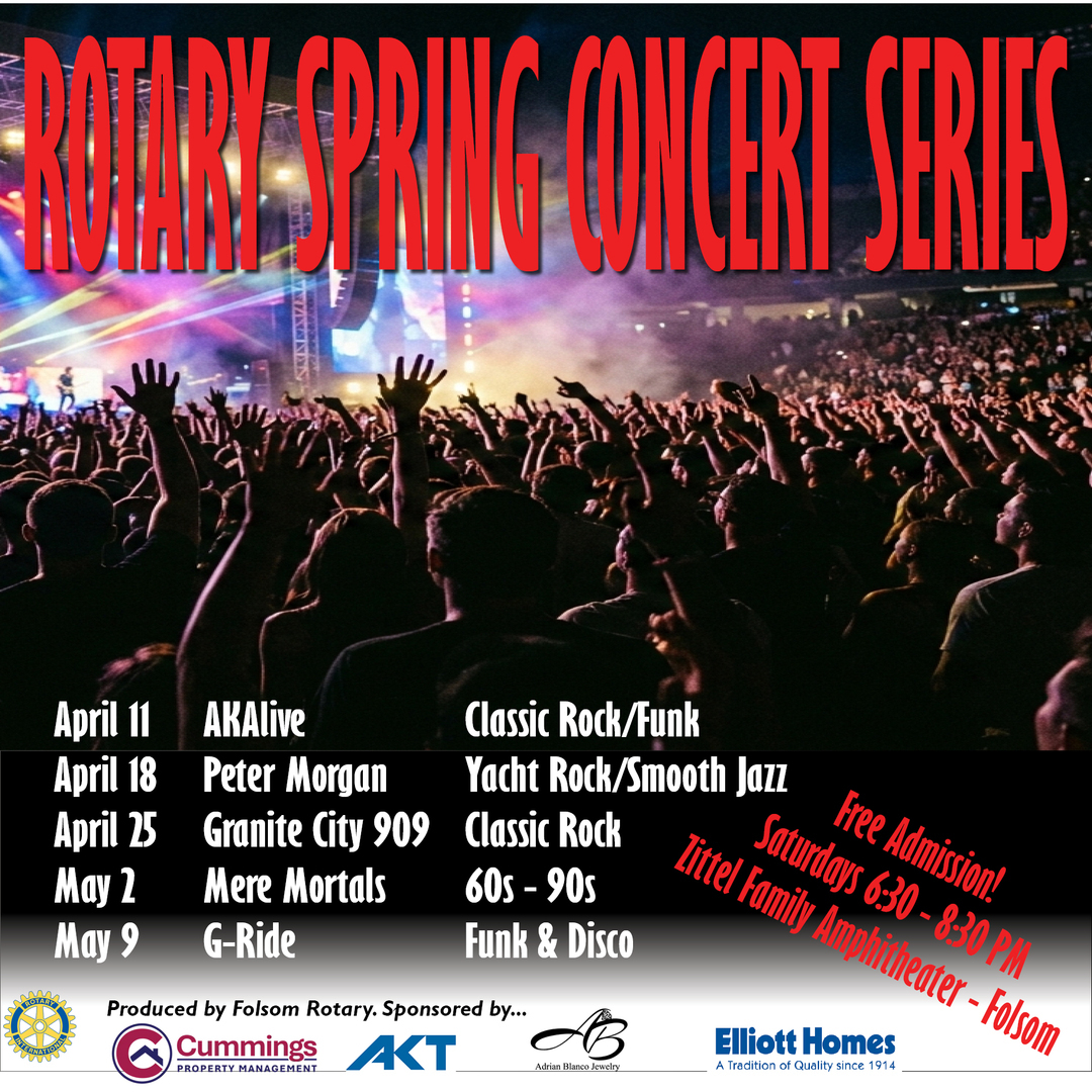 The Rotary Spring Concert Series returns to Historic Folsom! Join us for a free evening of live music, dancing, and community fun at the Zittel Family Amphitheater.