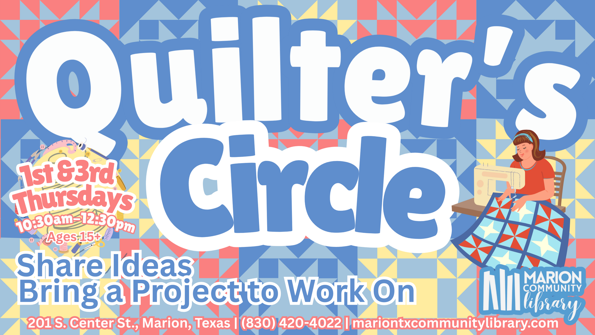 HomeEventsQuilter's Circle Quilter's Circle Thursday, April 02, 2026 10:30 AM - 12:30 PM 10:30 AM - 12:30 PM See all dates and Times 201 S Center St Parking Deals Get a Ride LYFT UBER Add to Calendar 04/02/2026 10:30 AM 04/02/2026 12:30 PM America/Bahia_Banderas Quilter's Circle Bring your projects.Event LinksWebsite: https://go.evvnt.com/3472624-0 Details & Tickets: https://www.upcomingevents.com/san-antonio/events/201-s-center-st/quilters-circle-599001?ref=uceaddevent 201 S Center St, 201 South Center Street, Marion, TX, 78124 Set Reminder Categories Arts Oriented, Kids & Family View Event Website » Bring your projects.Event LinksWebsite: https://go.evvnt.com/3472624-0
