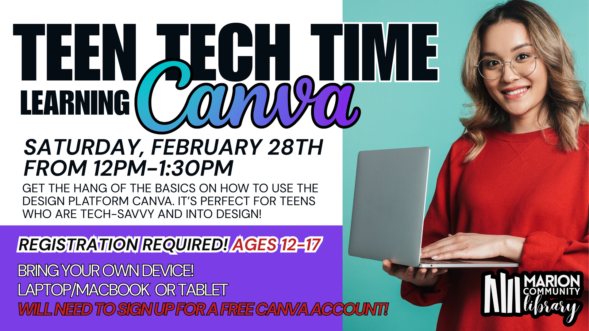 HomeEventsTeen Tech Time Teen Tech Time Saturday, February 28, 2026 12:00 PM - 1:30 PM 12:00 PM - 1:30 PM See all dates and Times 210 S Center St Parking Deals Get a Ride LYFT UBER Add to Calendar 02/28/2026 12:00 PM 02/28/2026 01:30 PM America/Bahia_Banderas Teen Tech Time Bring your own device (MacBook, laptop, or tablet) Registration is required. You will need to signup for a free Canva account!Event LinksWebsite: https://go.evvnt.com/3472663-0 Details & Tickets: https://www.upcomingevents.com/san-antonio/events/210-s-center-st/teen-tech-time-599029?ref=uceaddevent 210 S Center St, 210 South Center Street, Marion, TX, 78124 Set Reminder Categories Education, Educational, Literary & Books View Event Website » Bring your own device (MacBook, laptop, or tablet) Registration is required. You will need to signup for a free Canva account!Event LinksWebsite: https://go.evvnt.com/3472663-0 Read More View Less