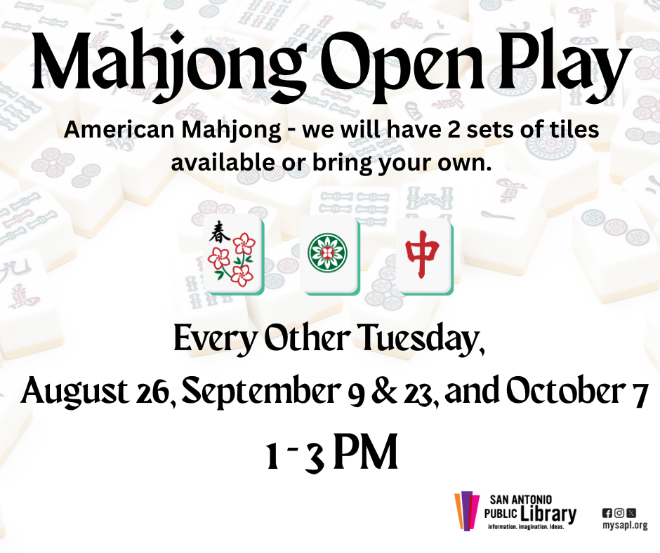 Drop in and join us for open play American Mahjong! Bring your own set, or use one of our two sets. Make some new friends while having fun!