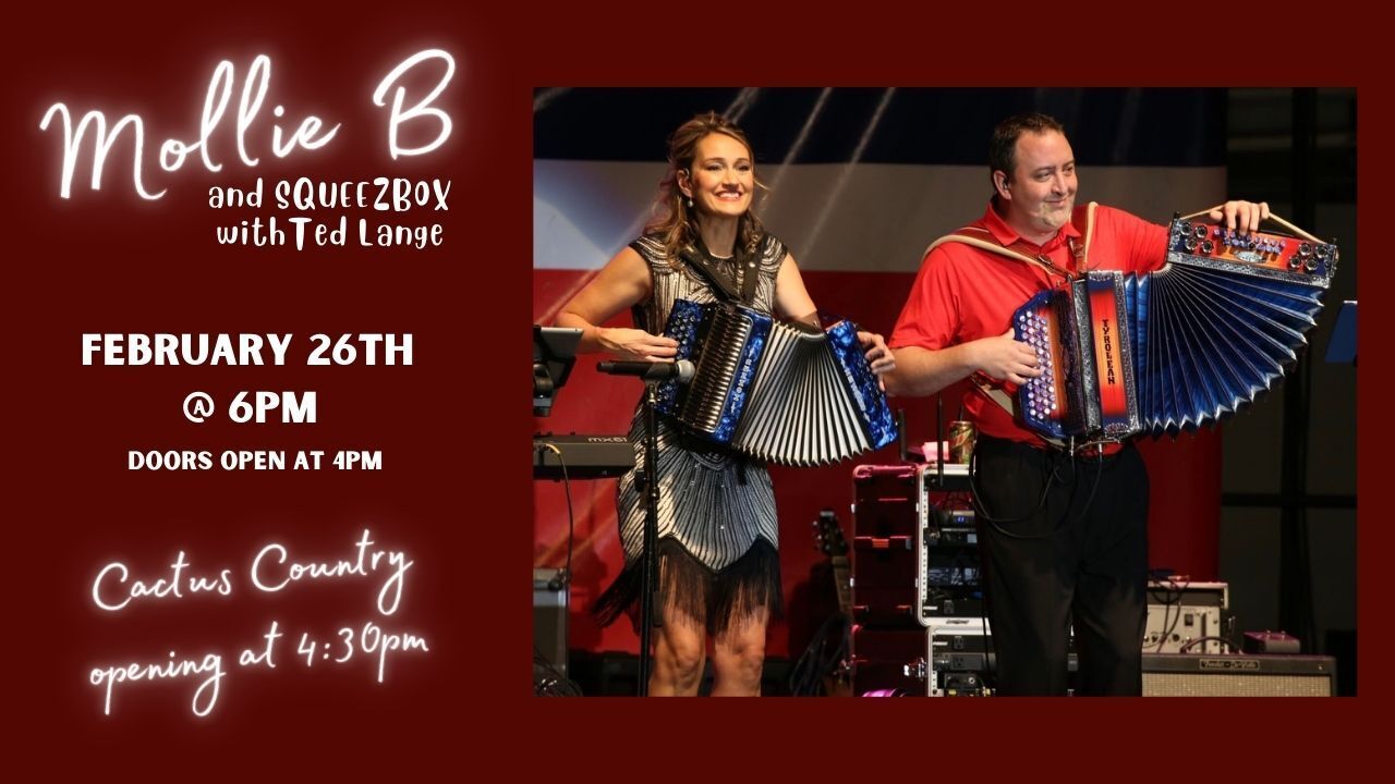 Join us on Thursday, February 26th at 6pm for Mollie B & SqueezeBox with Ted Lange. Doors open at 4pm with Cactus Country playing from 4:30-5:30pm and Mollie B taking the stage at 6pm