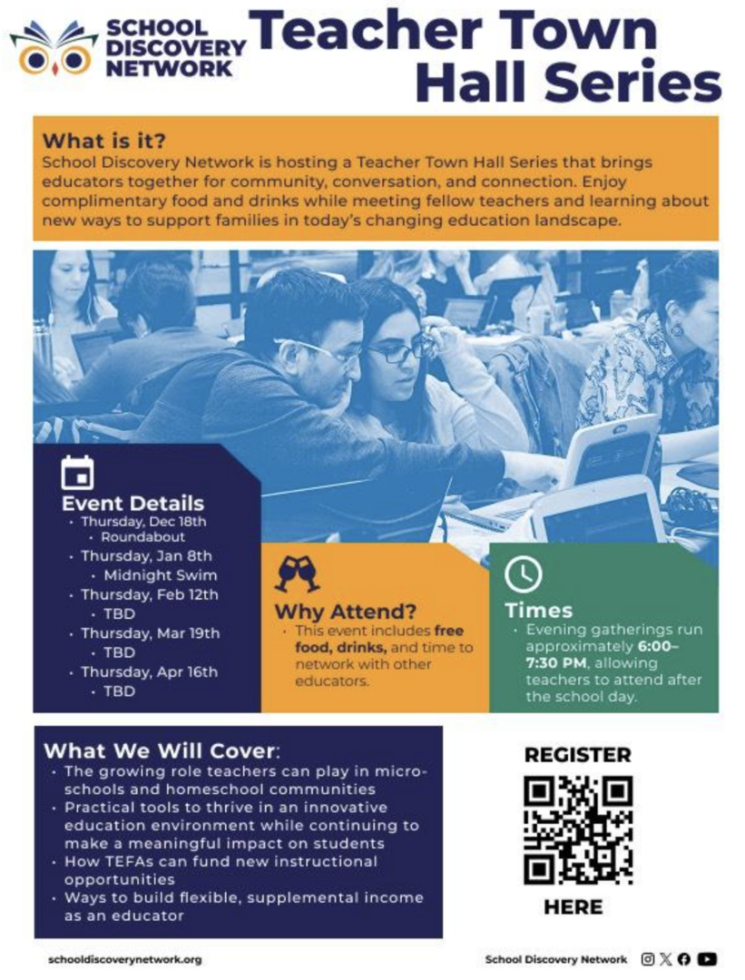 School Discovery Network hosts a Teacher Town Hall Series that brings educators together for community, conversation, and connection. Enjoy complimentary food and drinks while meeting fellow teachers and learning about new ways to support families in today's changing education landscape.