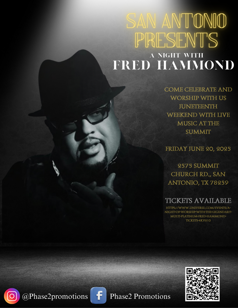 Come and join us for an unforgettable evening with gospel music legend and multi-platinum award winner Fred Hammond! This in-person event will be held at Summit Church, so mark your calendars and get ready for a night of soul-stirring music and worship. Don't miss out on this opportunity to experience the incredible talent of Fred Hammond live on stage. Grab your friends and family and make sure to be there!