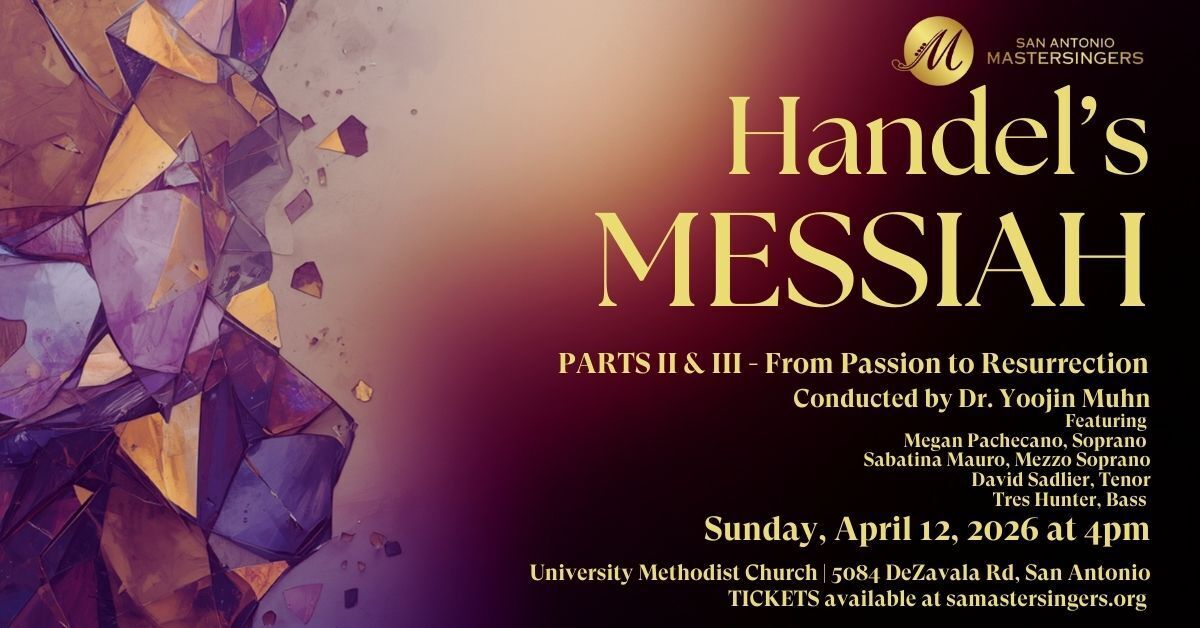 Building on the exceptional response to Handel’s Messiah, Part I — the Christmas selections -- presented last December, the San Antonio Mastersingers have added a special spring concert featuring Messiah, Parts II and III — From Passion to Resurrection -- on Sunday, April 12, 2026 at 4 p.m. at the acoustically beautiful University Methodist Church.